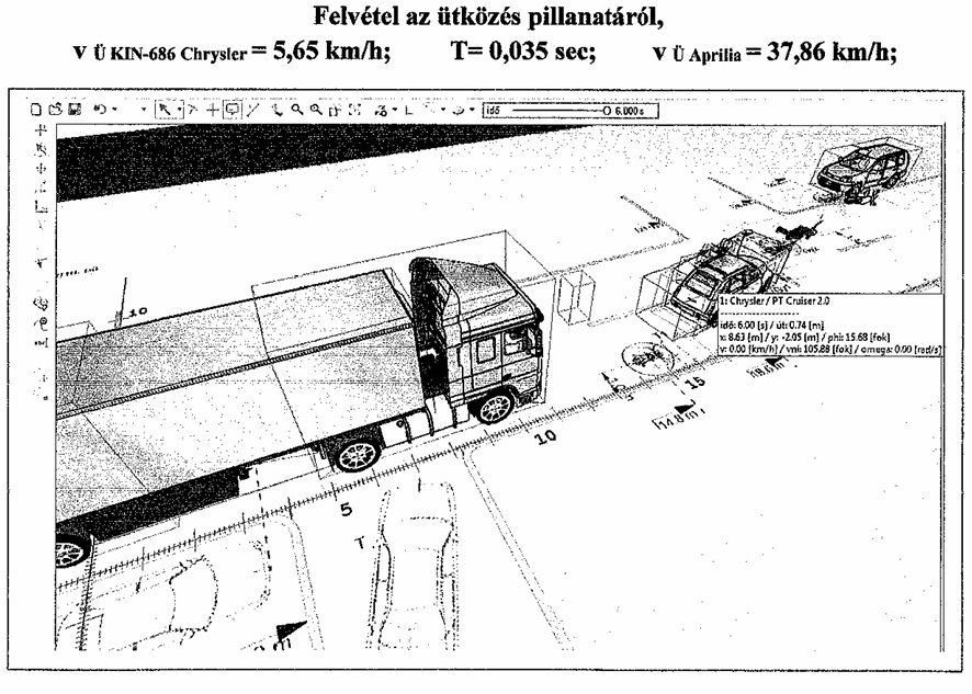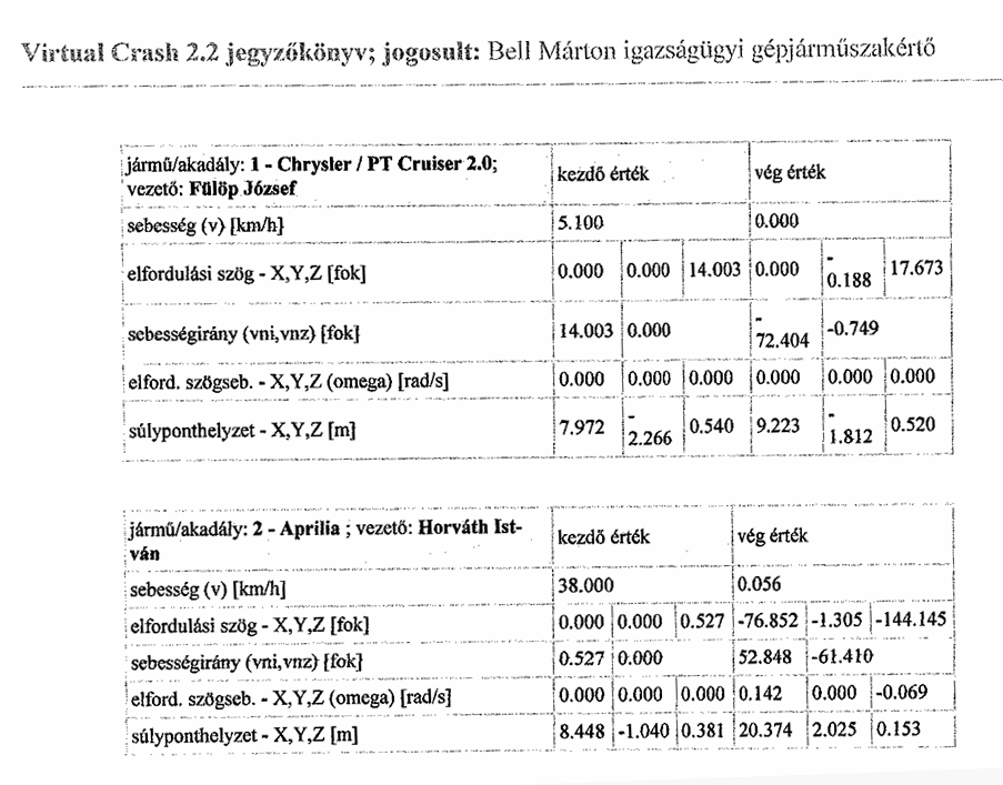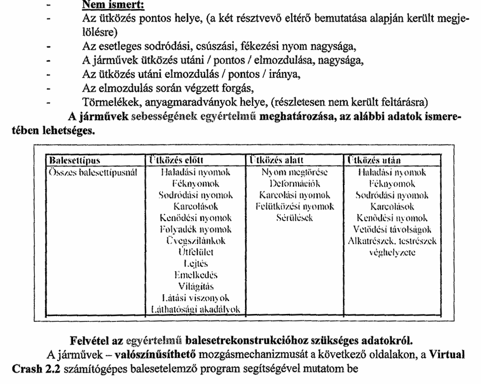 Azonkívül, hogy ő is felsorolja, hogy semmilyen adatot sem ismer, még leír 25 tételt, ami szükséges lenne a helyzet meghatározásához. A baj csak az, hogy ebből egyetlen egy sem volt adott, lévén, hogy nem volt akkor helyszínelés mivel robogósunk a helyszínről hazament a túloldalon 30 méterrel lejjebb levő házába. Azonban ez egy kiváló szakember számára nem jelent problémát - otthonról, két év múlva meghatározta a szükséges induló adatokat: vagyis, hogy az én kocsim 14 fokos szögben állt és 5 km/óra sebességgel haladt, a motoros sebessége pedig 38 km/óra volt. és 8 méterre volt tőlem,: