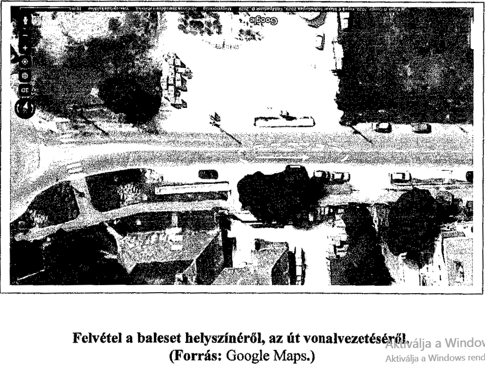 Most már csak egy pillantást kell vetni a legfelső légifelvételre, amely alján szintén látható az óvodai behajtó és ezzel szemben az út közepén még jócskán tartó záróvonal(!!!!). Vagyis szakértőnk által megrajzolt kép szerint motorosunk még akkor is a záróvonal túloldalán volt, amikor a kamion vezetőfülkéjénél tartott. Vajon mennyi szabálytalanságot követett el amikor sokkal korábban átlépte azt?