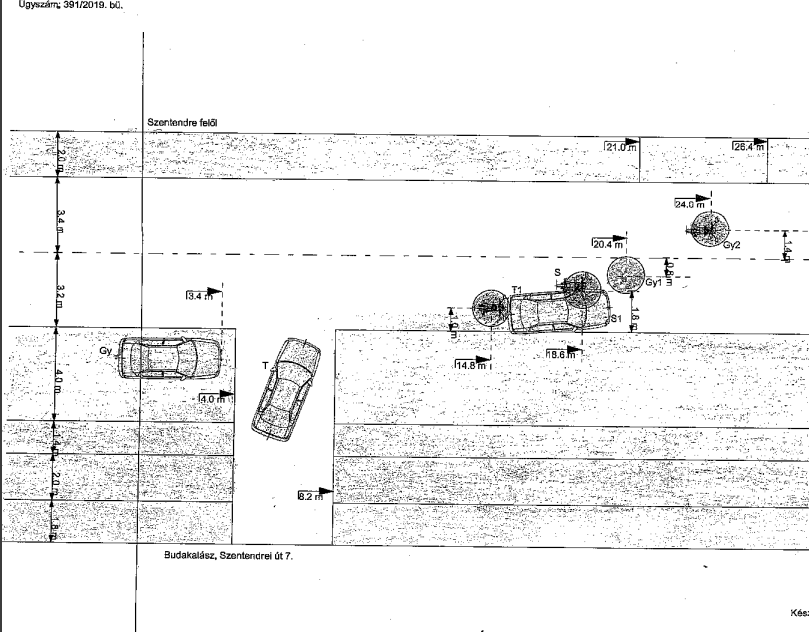 Sértett: a József A. útról hajtottam be a körforgalomba, majd a HÉV megálló felé hajtottam ki és a Szentendrei úton haladtam. Ott van egy óvoda, mely előtt a menetirány szerinti jobb oldalon padkán (!) egy addig ott álló gépkocsi hírtelen elém vágva akart a forgalomba becsatlakozni. Keresztben állt előttem, nem tudtam kikerülni így a bal első kerék és a sárvédő közé becsapódtam, nekiütköztem. Az ütközés követően a motorral együtt jobbra eldőltem.